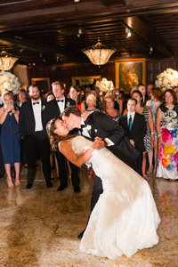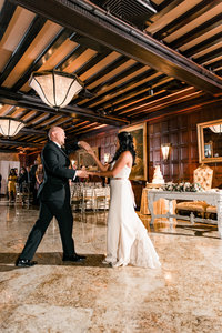 We actually prefer that you share your first dance right at the door. This will allow for your guests on both balconies and around the room to witness your first and parent dances. It also is easier for us to photograph than up on the catwalk or on the dance floor and will provide you with a better backdrop for photos.